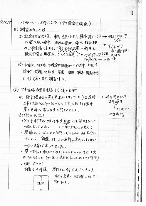 現在、展示・紹介中の柿生中学校考古学研究部の横穴古墳の研究について、実際に部員たちと行動を共にしながら、部員の自主性を尊重して、後方から部員たちの活動を支えた顧問の川瀬元教諭と、古墳の発見者の藤本隆氏、横穴古墳の実測図作成を担った三浦伸昭氏の三名の方をお招きして、当時の苦心談を種々語っていただこうと計画したセミナーです。 考古学研究部の横穴古墳調査は、麻生台団地西側給水塔の崖崩れのための、大規模な修復工事が進行中であったことから進行します。工事現場が通学路に当たる生徒たちの中に、社会研究クラブ員(後の考古学研究部の前身)がいたことが幸いして古墳の発見につながったのです。